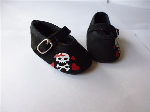 Svarta skor med en döskalle och hjärta som knäpps med kardborre. Sulans yttermått är ca 7 cm lång. De passar Baby Born (43 cm) & New Born Baby (43 cm). Pris: 115 kr.