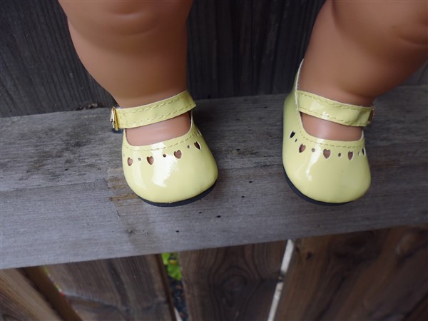 Gula lackskor som knäpps med kardborre. Skon är 7,2 cm lång och 3,9 cm bred. De passar Skrållan, även Baby Born & New Born Baby (43 cm) kan ha dem om de har en strumpa på foten. Pris: 119 kr