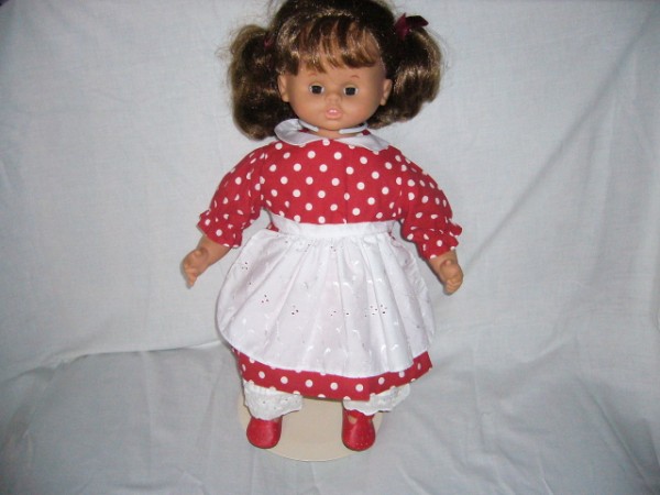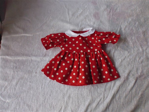 Röd klänning med vita prickar som knäpps med kardborre bak. Vitt förkläde som knyts och vita mamelucker med resår i midjan och benslut. Passar Skrållan & Baby Annabell (46 cm). Pris: 190 kr.