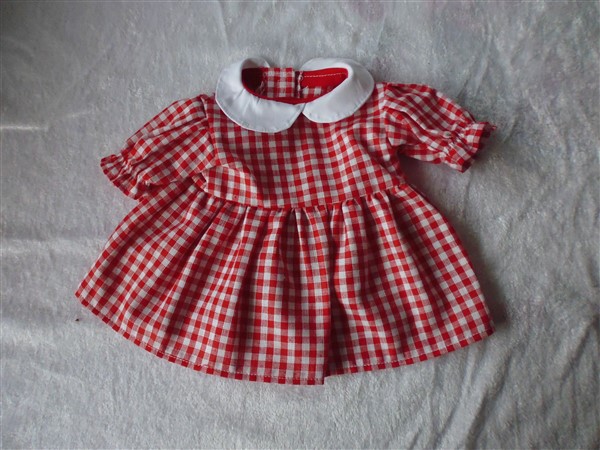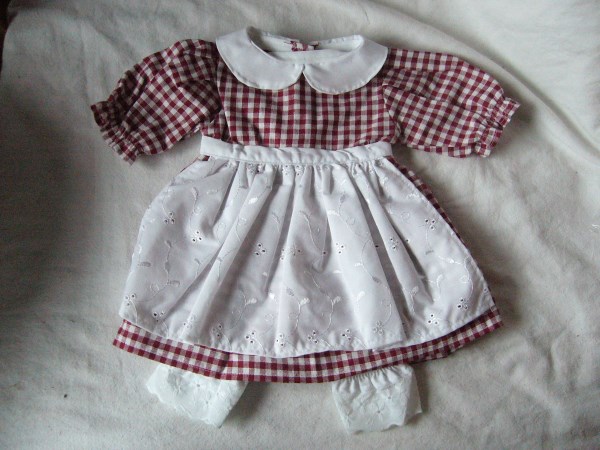 Vinröd & vit rutig klänning som knäpps med kardborre bak. Vitt förkläde som knyts och vita mamelucker med resår i midjan och benslut. Passar Skrållan & Baby Annabell (46 cm). Pris: 190 kr.