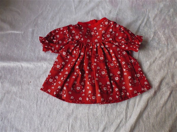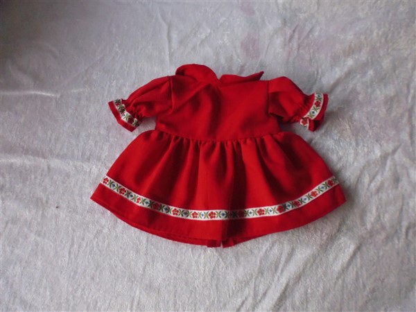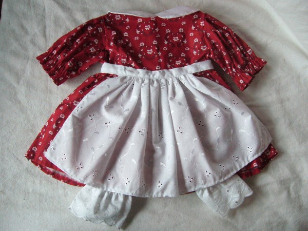 Röd klänning med vita blommor som knäpps med kardborre bak. Vitt förkläde som knyts och vita mamelucker med resår i midjan och benslut. Passar Skrållan & Baby Annabell (46 cm). Pris: 190 kr.