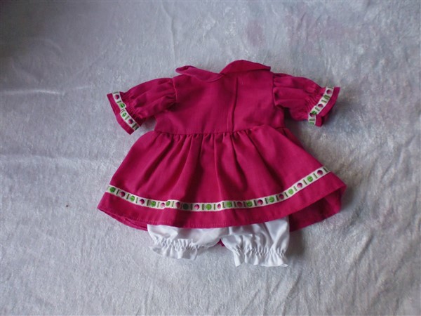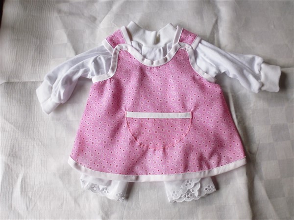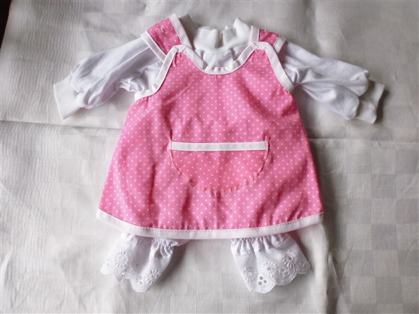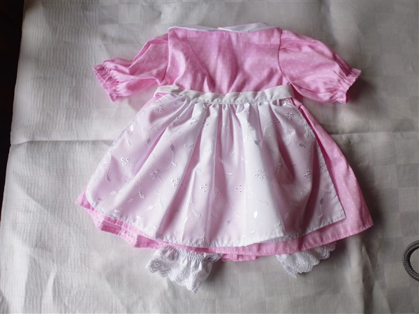 Rosa klänning med vita prickar som knäpps med kardborre bak. Vitt förkläde som knyts och vita mamelucker med resår i midjan och benslut. Passar Skrållan & Baby Annabell (46 cm). Pris: 190 kr.