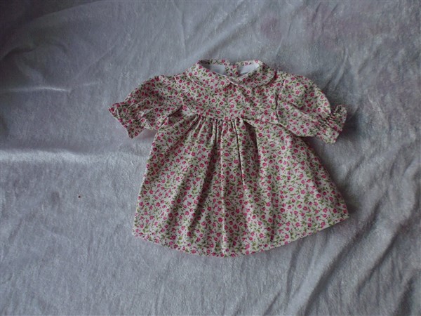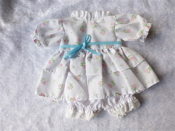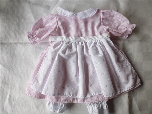 Rutig ljusrosa och vit klänning med blommor som knäpps med kardborre bak. Vitt förkläde som knyts och vita mamelucker med resår i midjan och benslut. Passar Skrållan & Baby Annabell (46 cm). Pris: 190 kr.