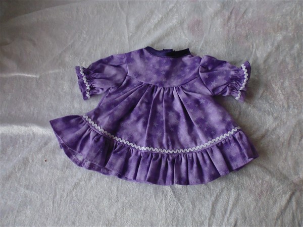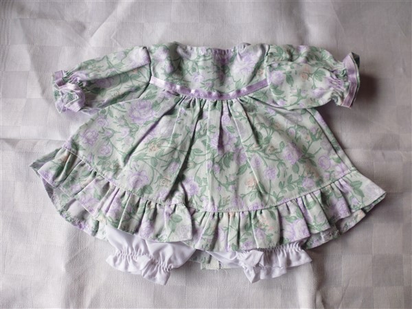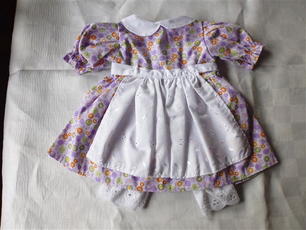 Lila klänning med blommor som knäpps med kardborre bak. Vitt förkläde som knyts och vita mamelucker med resår i midjan och benslut. Passar Skrållan & Baby Annabell (46 cm). Pris: 190 kr.