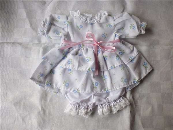 Vit klänning med blå blommor och rosa band som knäpps med kardborre bak. Vita mamelucker med resår i midjan och benslut. Passar Lillan. Pris: 150 kr.