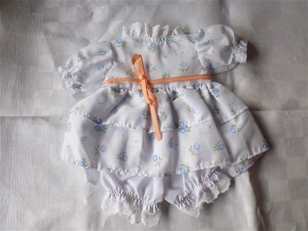 Vit klänning med blå blommor och aprikos band som knäpps med kardborre bak. Vita mamelucker med resår i midjan och benslut. Passar Lillan. Pris: 150 kr.