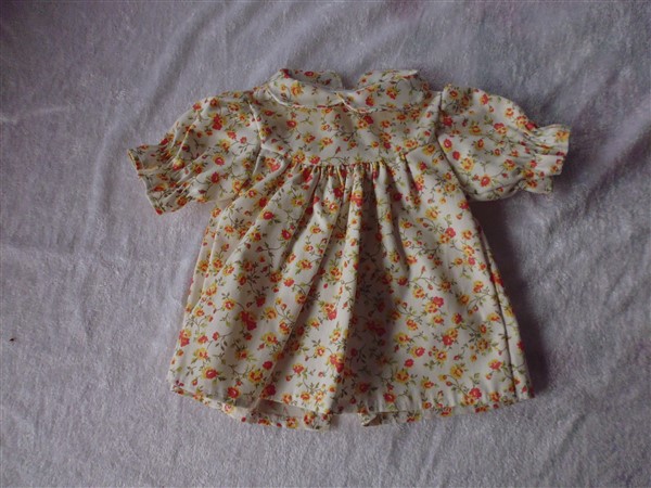 Klänning med gula & rödaktiga blommor som knäpps med kardborre bak. Passar Lillan. Pris: 120 kr. Fri frakt inom Sverige.