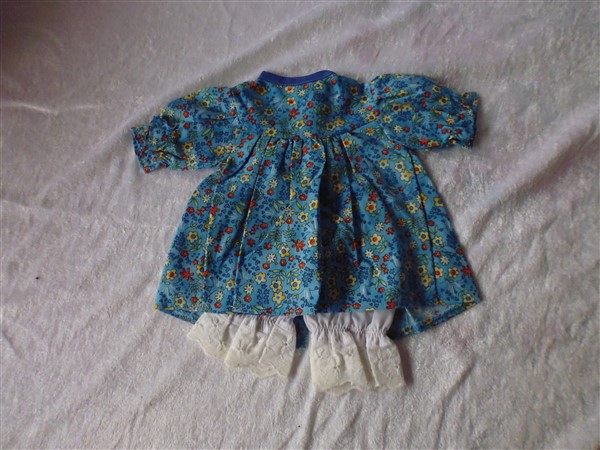 Blå klänning med blommor som knäpps med kardborre bak. Vita mamelucker med resår i midjan och benslut. Passar Lillan. Pris: 150 kr.