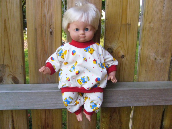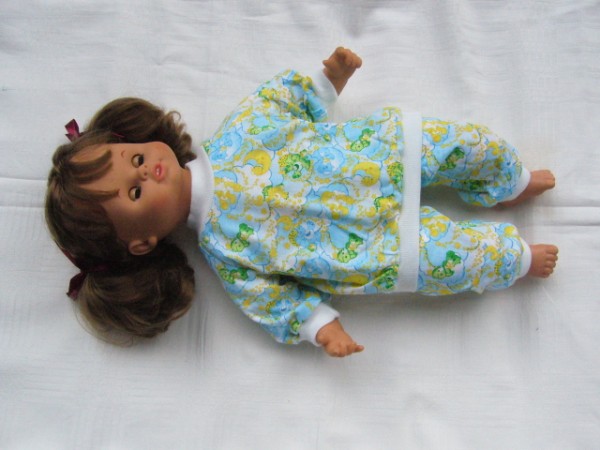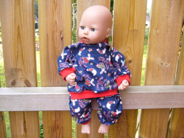 Tvådelad blå & röd pyjamas med bla kaniner. Tröjan har mudd i hals,armar och linning. Byxorna har resår i midjan och muddar vid fötterna. Passar Skrållan, Baby Annabell (46 cm) & Chou Chou (48 cm). Pris: 115 kr.