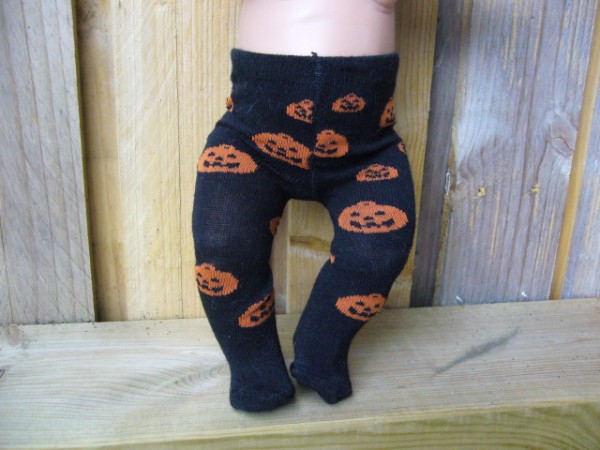 Svarta strumpbyxor med orange pumpor. De passar Skrållan, Baby Born, New Born Baby (Simbas 43cm). Pris: 78 kr.