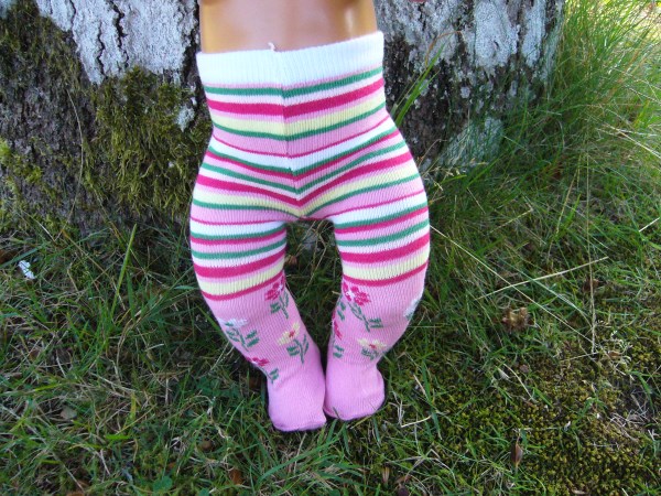 Rosa, röda, gröna, gula & vita randiga strumpbyxor med blommor. De passar bla Skrållan, Baby Born, New Born Baby (Simbas 43cm). Pris: 78 kr.