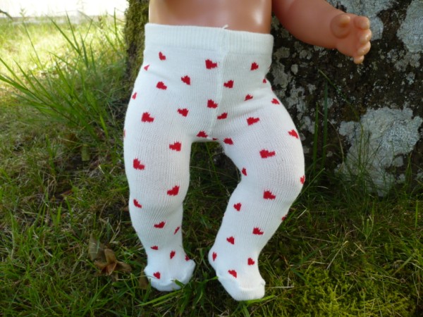 Vita strumpbyxor med röda hjärtan. De passar Skrållan, Baby Born, New Born Baby (Simbas 43cm). Pris: 78 kr.