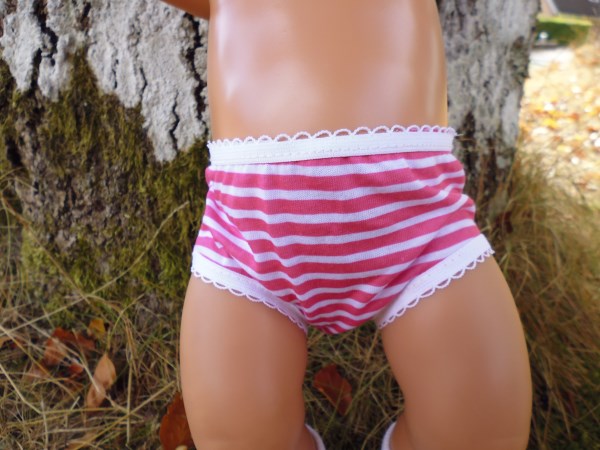 Vita och cerise randiga trosor. De passar Baby Born & New Born Baby (43 cm). Pris: 53 kr.