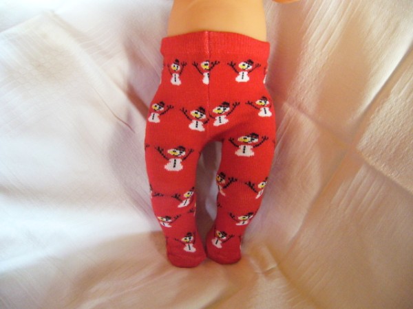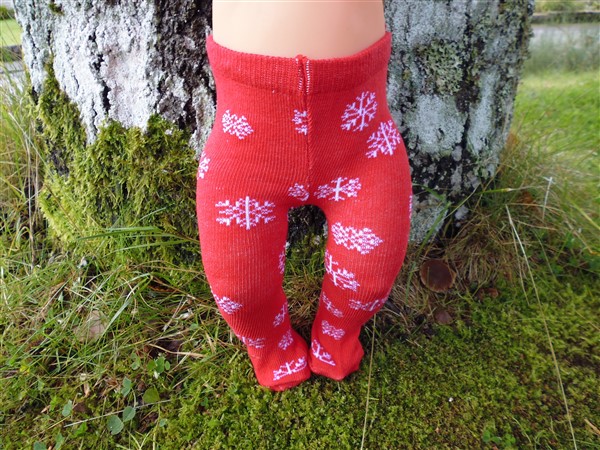 Röda strumpbyxor med snöflingor. De passar bla Skrållan, Baby Born, New Born Baby (Simbas 43cm). Pris: 78 kr.