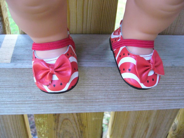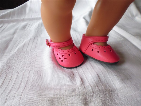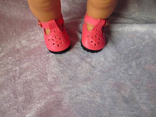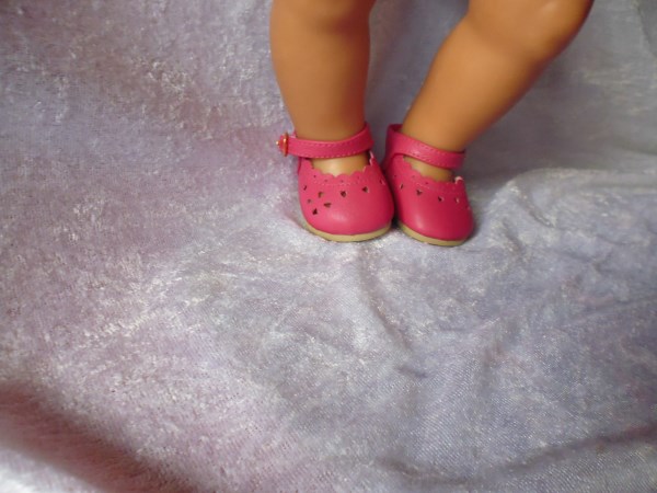 Cerise skor som knäpps med kardborre. Skon är 6,8 cm lång och 3,8 cm bred. De passar till Baby Born & New Born Baby (43 cm). Pris: 119 kr.