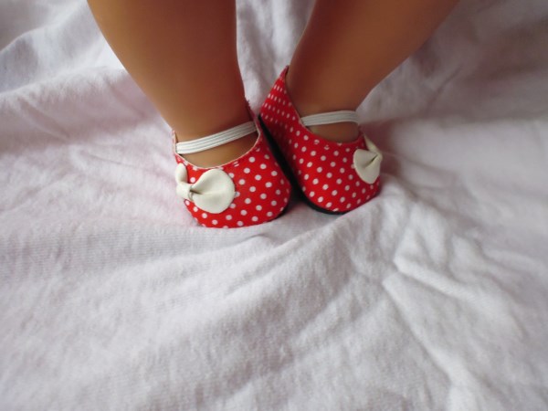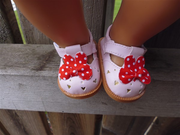 Röd och vita skor med en rosett. Ingen knäppning, bara att stoppa i foten. Sulans yttermått är ca 7 cm lång. De passar Skrållan. Även Baby Born & New Born Baby (43 cm)kan ha dem om de har en strumpa på foten Pris: 115 kr.