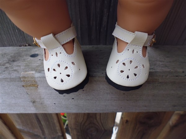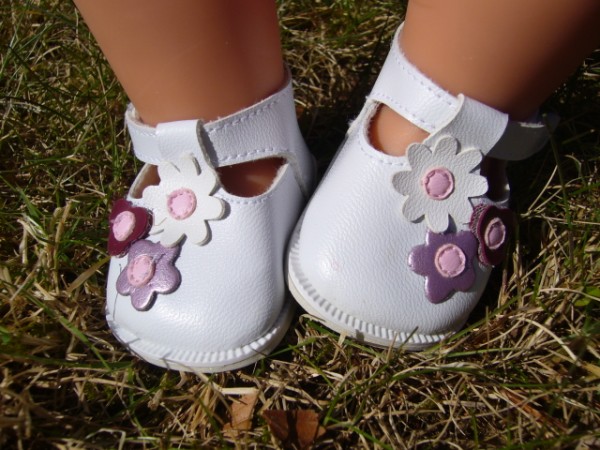 Vita skor med blommor som knäpps med kardborre. Sulans yttermått är 7 cm. De passar Baby Born & New Born Baby (43 cm). Pris: 115 kr.