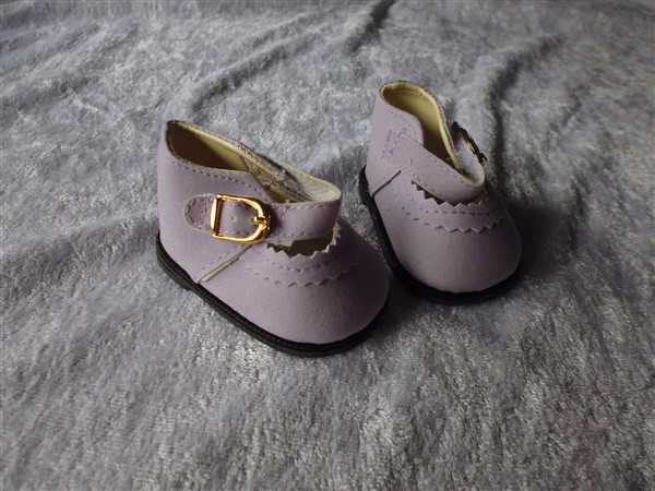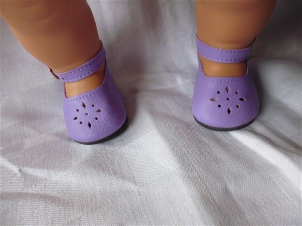 Lila skor med vristrem som knäpps med spänne. Skon är 7,2 cm lång och 3,9 cm bred. De passar Skrållan. Även Baby Born & New Born Baby (Simbas 43 cm) kan ha dem om de har en strumpa på foten. Pris: 119 kr.
