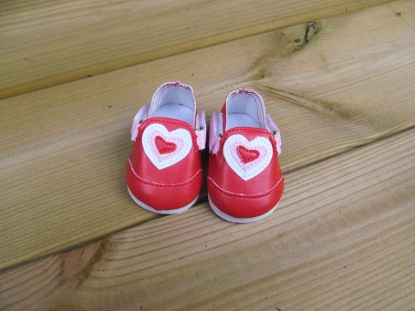 Röda skor med ett hjärta. De knäpps med små kardborre. Sulans yttermått är 7 cm. De passar Skrållan, Baby Born & New Born Baby (43 cm). Pris: 115 kr.