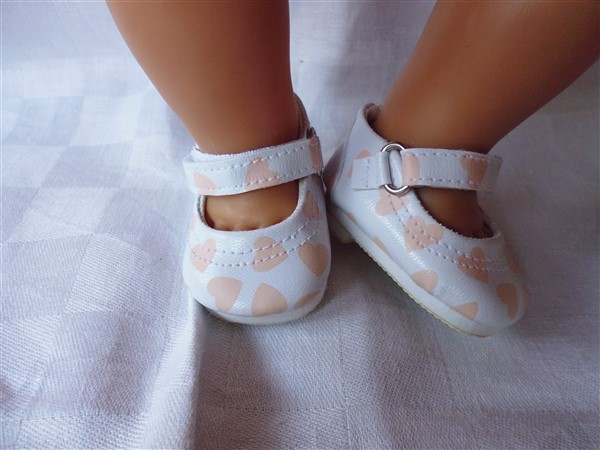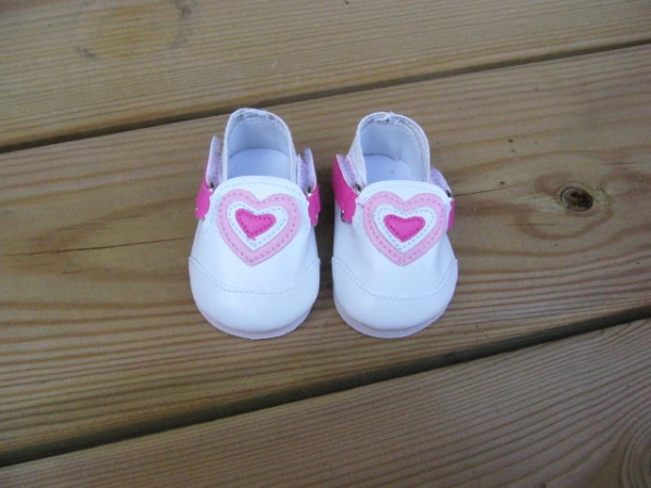 Vit/cerise skor med ett hjärta. De knäpps med små kardborre. Sulans yttermått är 7 cm. De passar Skrållan, Baby Born & New Born Baby (43 cm). Pris: 115 kr.