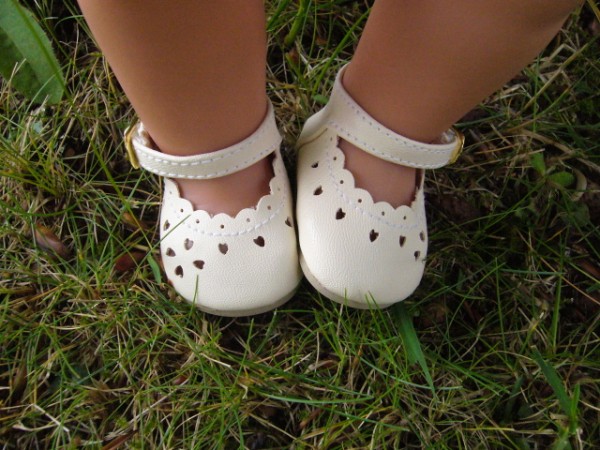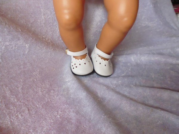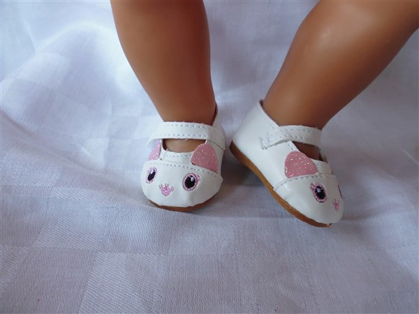 Vita skor som knäpps med kardborre. Skon är 7,2 cm lång och 3,9 cm bred. De passar Skrållan, även Baby Born & New Born Baby (43 cm) kan ha dem om de har en strumpa på foten. Pris: 119 kr.