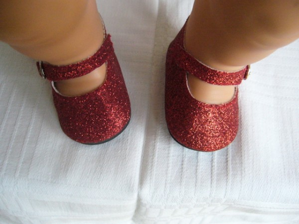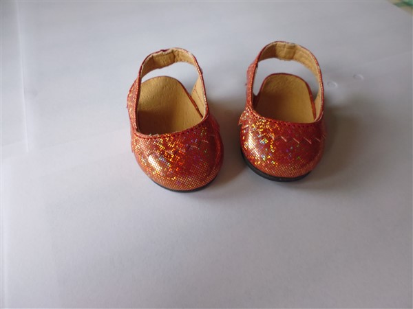 Glittrande röda skor som knäpps med kardborre. Skon är 7,2 cm lång och 3,9 cm bred. De passar Skrållan. Baby Born & New Born Baby (43 cm) kan också ha dom om de har en strumpa. Pris: 115 kr.