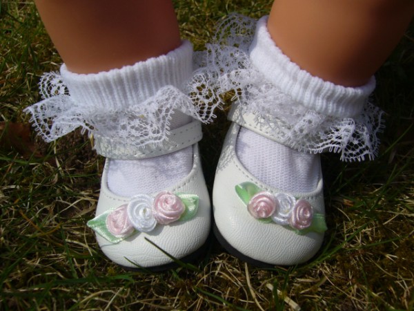 Beige skor med en vit rosett som knäpps med kardborre. Sulans yttermått är 7 cm. De passar Skrållan. Även Baby Born & New Born Baby (43 cm) kan ha dem om de har en strumpa på foten. Pris: 115 kr.