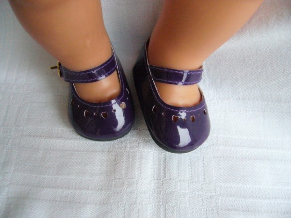 Mörklila skor som knäpps med kardborre. Skon är 6,8 cm lång och 3,9 cm bred. De passar Baby Born & New Born Baby (43 cm). Pris: 119 kr.