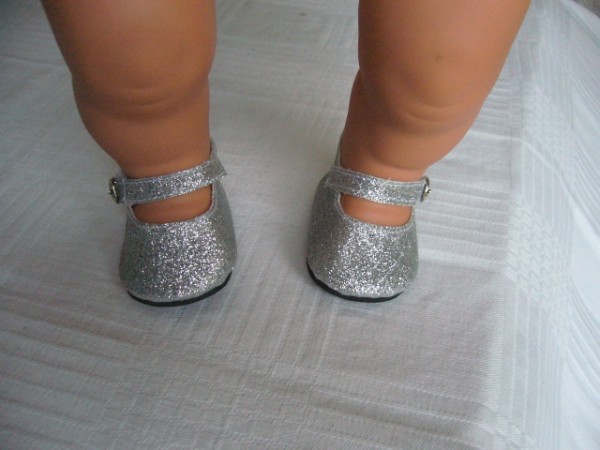 Glittrande silver skor som knäpps med kardborre. Sulans yttermått är 7 cm. De passar Skrållan. Även Baby Born & New Born Baby (43 cm) kan ha dem om de har strumpa på foten. Pris: 115 kr.