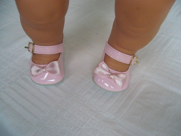 Rosa skor med en rosett som knäpps med kardborre. Sulans yttermått är 7 cm. De passar Skrållan, Baby Born & New Born Baby (43 cm). Pris: 115 kr.