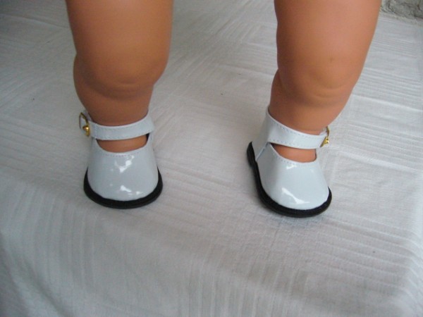 Blå skor med en vit rosett som knäpps med kardborre. Sulans yttermått är ca 7 cm. De passar Skrållan. Även Baby Born & New Born Baby (43 cm) kan ha dem om de har en strumpa på foten. Pris: 115 kr.