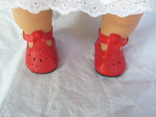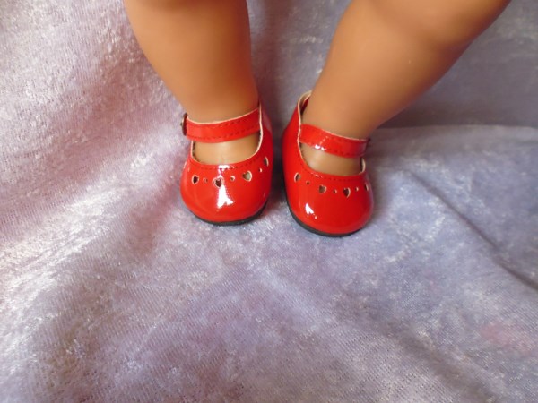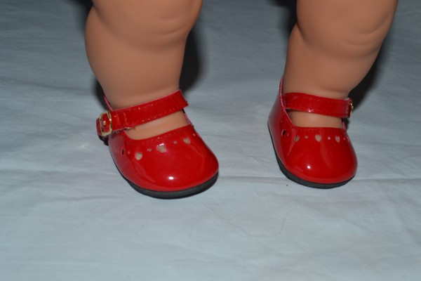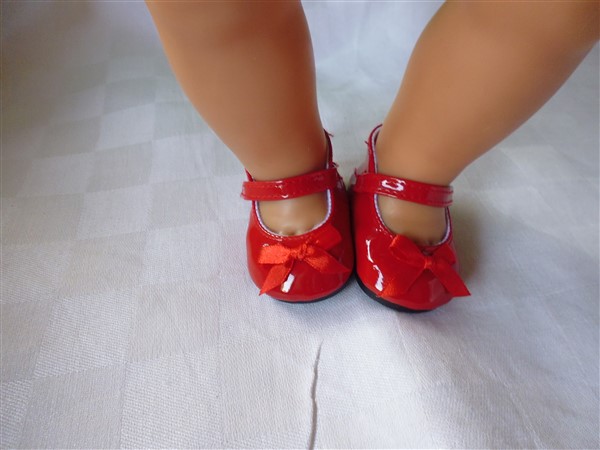 Röda skor som knäpps med kardborre. Skon är 7,2 cm lång och 3,9 cm bred. De passar Skrållan, även Baby Born (43 cm) och New Born Baby (43 cm) kan ha dem om de har en strumpa på foten. Pris: 119 kr.