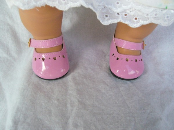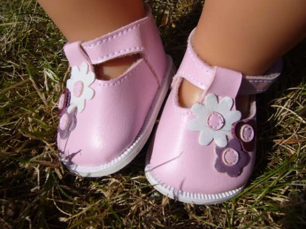 Rosa skor med blommor som knäpps med kardborre. Sulans yttermått är 7 cm. De passar Baby Born & New Born Baby (43 cm). Pris: 115 kr.