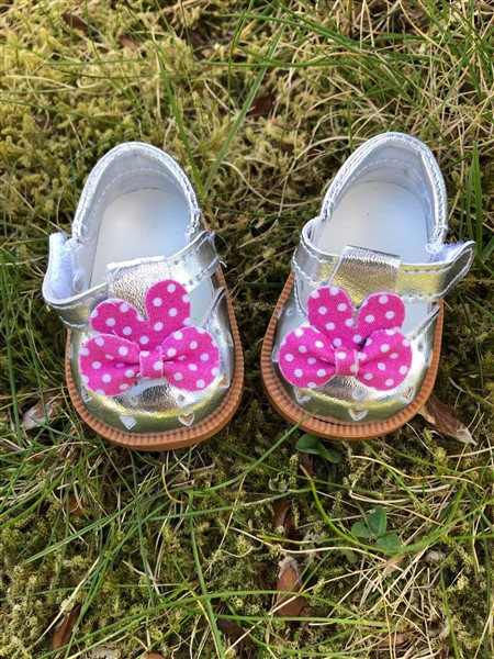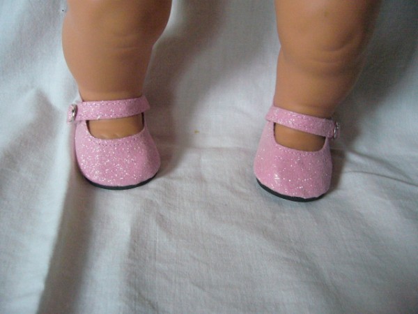 Glittrande rosa skor som knäpps med kardborre. Sulans yttermått är 7 cm. De passar Skrållan. Även Baby Born & New Born Baby (43 cm) kan ha dem om de har strumpa på sig. Pris: 115 kr.