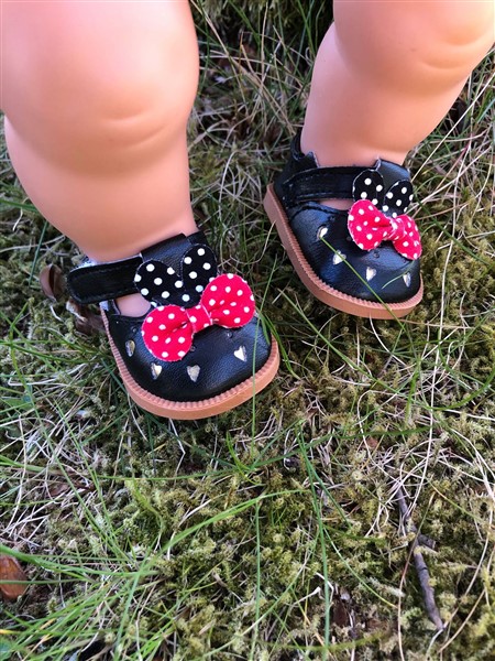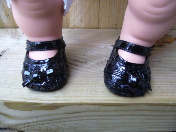 Svarta skor med paljetter och en rosett. Den knäpps med kardborre. Sulans yttermått är 7 cm. De passar Skrållan. Även Baby Born & New Born Baby (Simbas 43 cm) kan ha dem om de har en strumpa på foten. Pris: 115 kr.