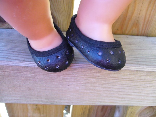 Svarta skor med utstansade stjärnor. Sulans yttermått är 6,6 cm. Passar Baby Born & New Born Baby (43 cm). Pris: 115 kr.