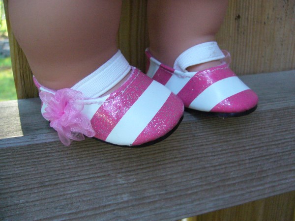 Rosa och vitrandiga skor med en blomma på sidan. Ingen knäppning, bara att stoppa i foten. Sulans yttermått är ca 7 cm lång. De passar Skrållan. Även Baby Born & New Born Baby (43 cm)kan ha dem om de har en strumpa på foten Pris: 115 kr.