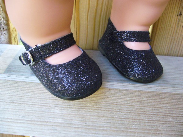 Glittrande svarta skor som knäpps med kardborre. Sulans yttermått är ca 7 cm lång. De passar Skrållan. Även Baby Born & New Born Baby (43 cm)kan ha dem om de har en strumpa på foten. Pris: 115 kr.