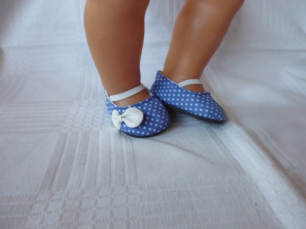 Blå skor med vita prickar och en rosett. Ingen knäppning, bara att stoppa i foten. Sulans yttermått är ca 7 cm lång. De passar Baby Born & New Born Baby (43 cm) Pris: 109 kr.