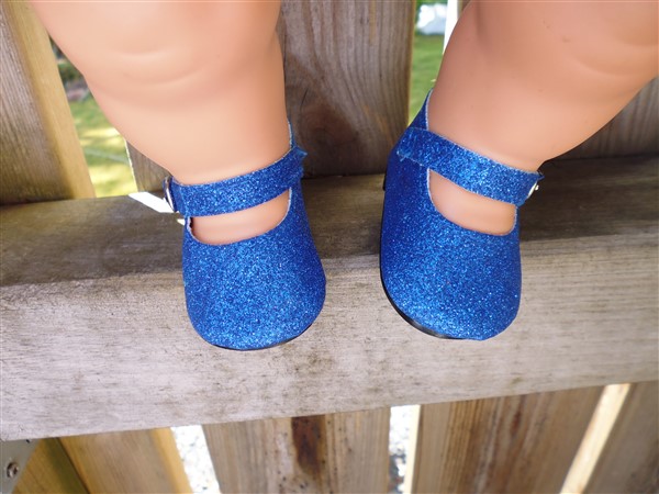 Glittrande blå skor som knäpps med kardborre. Sulans yttermått är ca 7 cm lång. De passar Skrållan. Även Baby Born & New Born Baby (43 cm) kan ha dem om de har en strumpa på foten. Pris: 119kr.