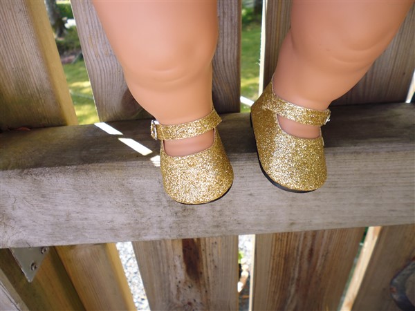 Glittrande "guld" skor som knäpps med kardborre. Sulans yttermått är ca 7 cm lång. De passar Skrållan. Även Baby Born & New Born Baby (43 cm)kan ha dem om de har en strumpa på foten. Pris: 115 kr.