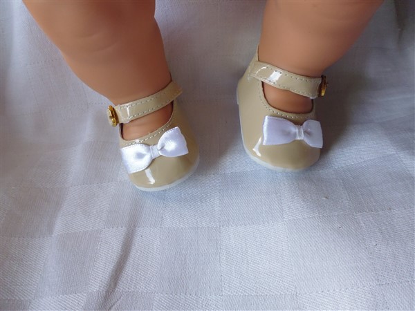 Beige skor som knäpps med kardborre. Skon är 6,8 cm lång och 3,8 cm bred. De passar Skrållan, Baby Born & New Born Baby (43 cm). Pris: 119 kr.