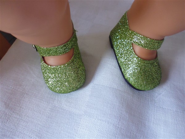 Glittrande gröna skor som knäpps med kardborre. Sulans yttermått är ca 7 cm lång. De passar Skrållan. Även Baby Born & New Born Baby (43 cm) kan ha dem om de har en strumpa på foten. Pris: 115 kr.