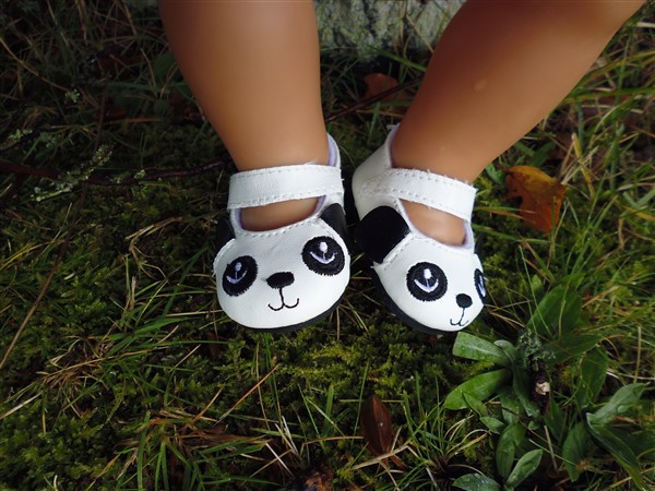 Benvita skor med motiv av en panda som knäpps med kardborre. Sulans yttermått är 7 cm. De passar bla Baby Born & New Born Baby (43 cm). Pris: 115 kr.