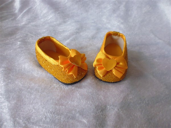 Glittrande gula skor med en rosett. Sulans yttermått är ca 7,5 cm. Passar Skrållan, Baby Born & New Born Baby (43 cm). Pris: 119 kr.