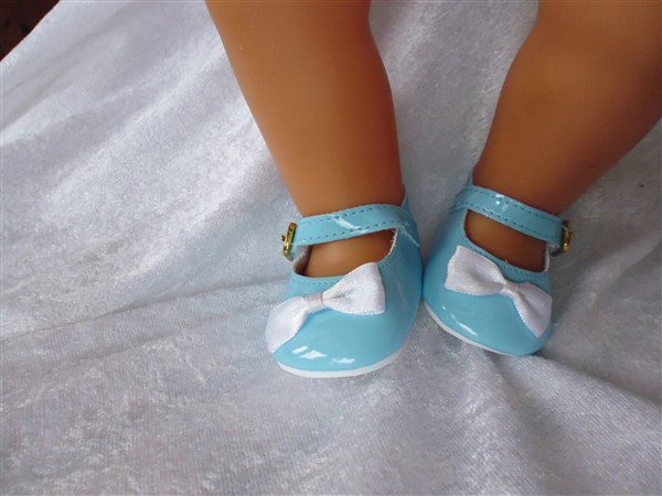 Ljusblå skor som knäpps med kardborre. Skon är 7,2 cm lång, och 3.9 cm bred. De passar Skrållan, även Baby Born & New Born Baby (43 cm) kan ha dem om de har en strumpa på foten. Pris: 119 kr.