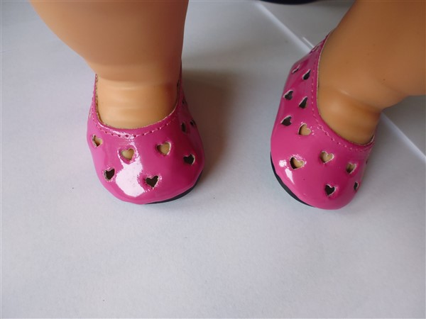 Cerise skor med utstansade hjärtan. Sulans yttermått är ca 7 cm. Passar Skrållan även Baby Born (43 cm) & New Born Baby (43 cm) kan ha dem om de har en strumpa på foten. Pris: 115 kr.