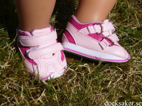 Rosa skor med kardborreknäppning. Sulans yttermått är 7 cm. Passar Baby Born & New Born Baby (43 cm). Pris: 125 kr.