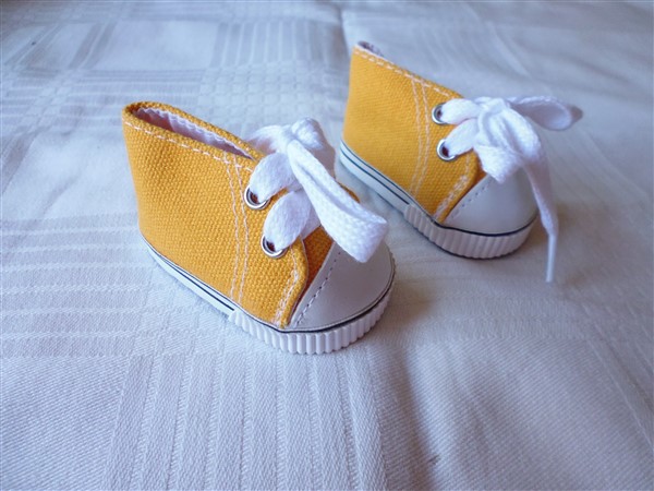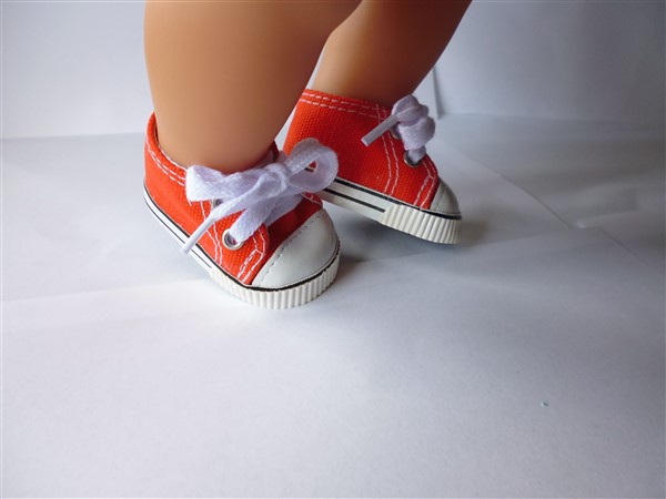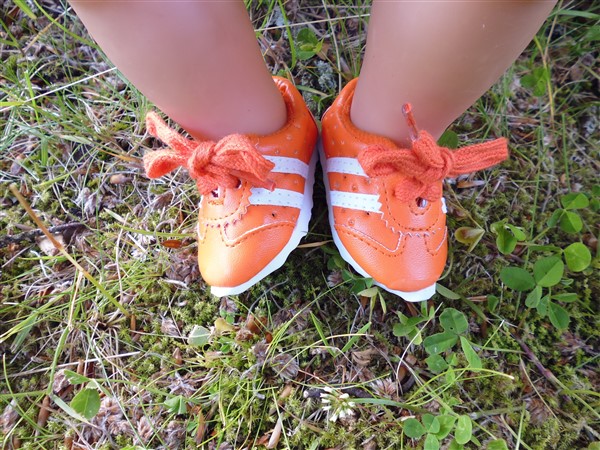 Orange & vita gympaskor. Sulans yttermått är 7 cm. Passar Baby Born & New Born Baby (Simbas 43cm). Pris: 115 kr.