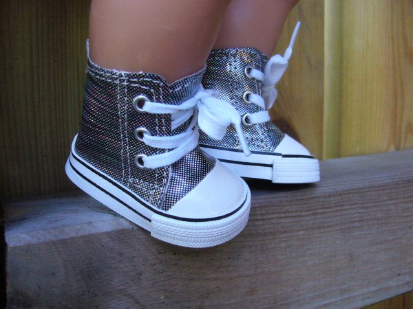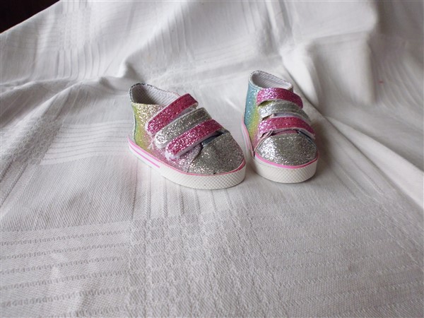 Glittrande skor i olika färger som knäpps med kardborre. Sulans yttermått är 8 cm. De passar Baby Born & New Born Baby (Simbas 43 cm). Pris: 100 kr.